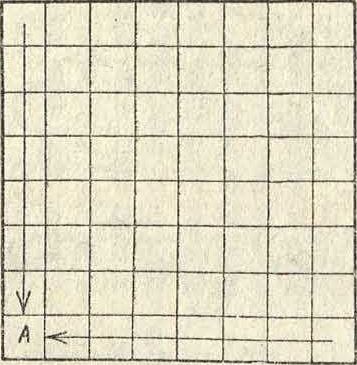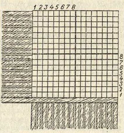 Переплетать нити основы и утка можно весьма различно; для этого в ткачестве применяются различные механизмы: эксцентрики, каретка Добби и жаккардные машины. Существует громадное количество различных форм переплетений и следовательно видов тканей. По определении конструкции ткани, то есть формы или рода ее переплетения, необходимо определить для каждой нити (обычно уточной) порядок, в котором чередуются на ней основные и уточные перекрытия. Этот порядок чередования основных и уточных перекрытий, нанесенный условным обозначением на бумагу,носит название рисунка переплетения (фигура 2), процесс Hie нанесения услввных обозначений на бумагу носит название ткацкого рисования. Для изображения форм переплетений обыкновенно пользуются клетчатой (канвовой) или же числительной бумагой. Каждый вертикальный ряд квадратиков бумаги обозначает одну основную нить. Порядковый счет им ведется слева направо (фигура 3). Каждый горизонтальный ряд квадратиков бумаги при расчете соответствует одной уточной нити. Счет им ведется снизу вверх. Каждый отдельный вертикальный и горизонтальный ряд квадратиков (фигура 4) при своем пересечении встречает соответствующий квадратик А, который и будет· представлять собой место пересечения основной нити с уточной, или же соответствующее, основное или уточное, перекрытие. Согласно принятому выше условию в каждом горизонтальном ряду соответствующие основным перекрытиям квадратики закрыва