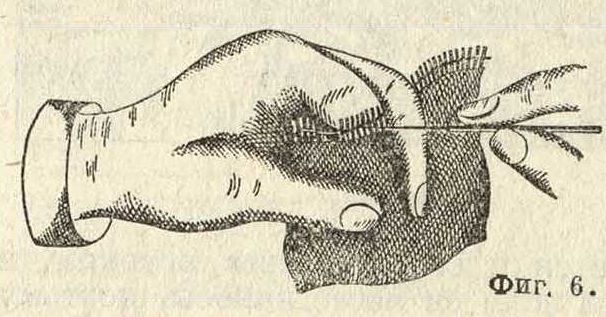 Во всякого рода и вида ткани порядок чередования основных и уточных перекрытий будет всегда представлять собой соответствующую группировку, или комбинацию, перекрытий с определенным числом входящих в нее основных и уточных нитей, которая тождественно повторяется по направ лениям основы и утка. Каждая такая группировка, или комбинация, основных и уточных перекрытий, тождественно повторяющаяся как по ширине, так и длине ткани, будет называться раппортомП. т. Число нитей основы, входящее в раппорт, будет называться раппортом основы, а число уточных нитей—р аппортом утка. Для определения в образце ткани конструкции переплетения основы с утком (смотрите Анализ тканей) прежде всего с помощью иглы выплетают (фигура 6 и 7) из образца ткани сверху или снизу несколько цельных уточных нитей, а слева—несколько цельных основных нитей. После этой операции отодвигают 1-ю уточную нить от остальных (фигура 8), ставят на нее ткацкую· лупу и начинают с 1-й основной нити с.