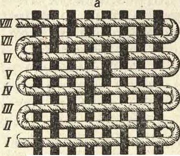 III и т. д., располагаясь также в параллельных друг другу плоскостях, идут в ткани перпендикулярно к основным нитям от одного края до другого; они определяют ширину ткани. При построении ткани в большинстве случаев нити основные имеют больше значения, чем уточные, причем они обра-