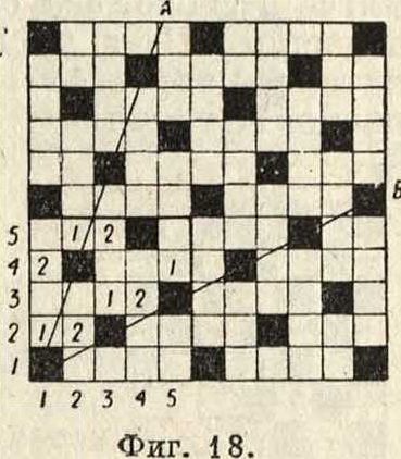 2-й в теории. Т. о. для получения правильного атласного переплетения,то есть закономерного расположения перекрытий в его раппорте, необходимо чтобы сдвиги S (основные или уточные) выражались чи взаимно первыми относительно размера раппорта п, однако не 1 и не и-1, a S>1 a S<n — 1. Это условие для размера раппорта п=3, 4 и 6 нитям невыполнимо, а потому правильное атласное П. т. возможно лишь, начиная с раппорта в 5, 7 нитей и выше. Если в данном атласном П. т. число сдвига S сделать= 1, или число нитей раппорта—· η—1, то атласное переплетение обратится в саржу, если нее сделать при этом и раппорт п=2 нитям, то получится гроденап-левое переплетепие. Среди П.т,гладкого класса атласное переплетение представляет как бы общий тип; упрощая его, переходим постепенно к саржевому и наконец к гроденап-левому П. т. В пределах раппорта рисунка атласного переплетения — равно как и саржевого—все перекрытия исходят от первого, располагающегося в нижнем левом углу раппорта. Порядок перекрытий (фигура 18) относительно исходного первого перекрытия наблюдается в раппорте по двум направлениям: по горизонтальному В — направление последующей уточной нити и по вертикальному А—последующая нить основы. В виду того что пере