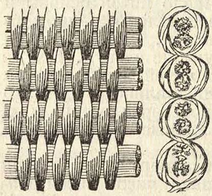 либо утком, которые затем расчесываются особыми приспособлениями. Смотря по роду нитей, образующих ворс, ворсовые ткани делятся на основноворсовые ткани (например бархат) и на уточноворсовые (плис. Манчестер). Основноворсовые ткани требуют двух основ: грунтовой, или изнаночной, и ворсовой. Уточноворсовые ткани состоят из од ной основы и двух утков, из которых один именуется грунтовым; он переплетается е грунтовой основой, а другой—ворсовым, образующим ворсовую поверхность ткани. Отношение ворсовой основы к грунтовой 1:2. Ворсовая ткань с низким ворсом называется бархатом, а с высоким ворсом — плюшем. Фигура 34 представляет разрез уточного, фигура 35—основного бархата. Для получения бархата в 2 полотна—саморезного—