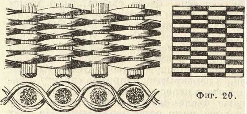 пенью и достижением техники переплетений и ткацкого производства, с помощью которых представляется возможность выполнять ткани, начиная с простого узора (фигура 39) и кончая художественными произведениями в виде портретов, тканых картин на различные сюжеты, тканых обоев и др., см. ирование.