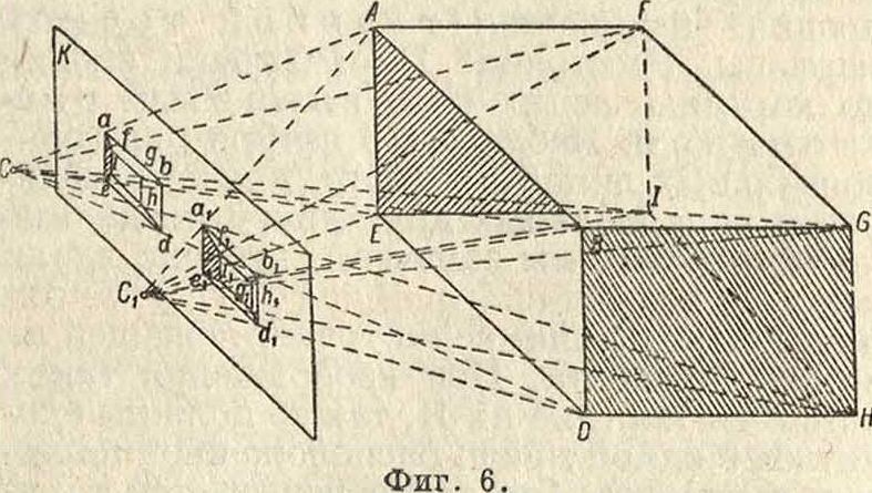 ния С. Примерами могут служить барельефы на памятниках, изображения на медалях и тому подобное. Кроме вышеописанных видов П., получаемых в предположении одной точки зрения,еще различают стереоперспективу, когда предмет изображается на плоскости с двух точек зрения, и т. о. получаются две его П. На фигуре 6 изображена комната ABDEFGHI, две точки зрения— два глаза С и О! и на картине К построены две перспективы abde. и с. а,Ь idjej.