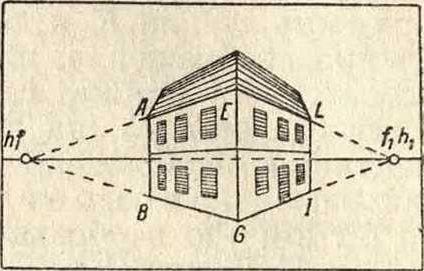 та АЕХ и BGlt которые перпендикулярны картине. Точка Х»! будет воздушной точкой схода, и в нее идет П. BE диагонали ВЕХквадрата, причем линия СВХ проведена параллельно ВЕХ. Точка Т>2 будет земной точкой схода, и в нее идет П. AG диагонали квадрата A Gx, линия CD2 проведена параллельно AG). На фигуре 8 приведен пример П. дома ABEGLI; показаны: линия горизонта hhx и точки схода /, перспективы двух групп горизонтальных и параллельных друг другу линий карнизов, поясков, основания и коньков крыши, левого и правого фасада. «