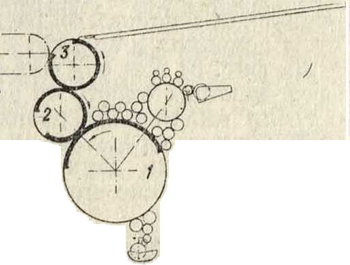 на высоте одной трети диаметра последнего. Под передаточным цилиндром расположен вспомогательный цилиндр 2 Фигура зз. Для вывода листов на приемный стол 3. У машин завода Франкенталь передаточный цилиндр лежит не прямо под формным, а несколько в сторону; рядом с ним лежит печатный цилиндр. В машине завода Поган-
