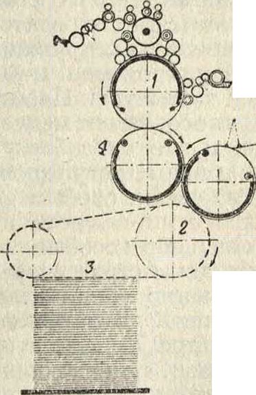 печатной форме, а третья часть, гладко отшлифованная, выполняет роль печатного цилиндра. Передаточный цилиндр 2, обтянутый резиновым полотном, имеет диам. в три