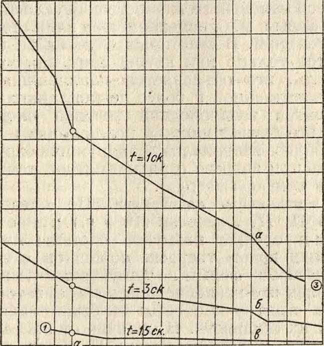 яия уменьшается с уменьшением нагрузки, то есть с увеличением времени разрезания, как это видно на фигуре 17, где кривая а соответствует времени действия в 1 ск., кривая б—времени действия в 3 ск., а кривая в— времени действия в 15 ск.; степень П. возрастает почти прямо пропорционально времени действия силы и почти обратно пропорционально значению силы.