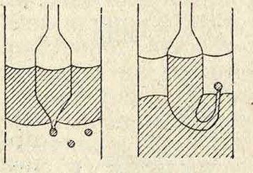мы видим, что П. н, обратно пропорционально числу капель и прямо пропорционально плотности жидкости, что очень важно при дозировке жидких лекарственных средств, отмеряемых по числу капель; например одна и та же масса чистой воды или водных растворов солей разбивается на 10 капель, а овых или эфирных жидкостей на 30 капель. Этот метод удобен для быстрых изменений П. н. на границе двух жидкостей. При этом одна жидкость выкапывается в среду другой жидкости, например масла в воду. Этим методом по Доннану (Donnan), по числу капель, то есть по понижению П. н., определяется способность масел эмульгироваться в воде и водных растворах, для чего с удобством служит пипетка Доннана (фигура 3). На границе жидкость— воздух, в особенности для растворов, капельный метод плохо применим из-за изменения концен- Г трации в поверхностном слое при испарении жидкости в окружающую среду. 3) Метод измерения наибольшего давления р1( при образовании пузырьков или капель, предложенный Симоном (Simon) и Кантором (М. Cantor), основан на том, что для образования пузырька воздуха или капли одной жидкости в среде другой из капилляра радиусом г необходим V избыток давления: