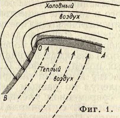 разное движение, сопровождаемое вихрями. В атмосфере происходит непрерывная борьба теплого воздуха юж. широт и холодного воздуха полярных областей. Эти массы, различающиеся по плотности, вклиниваются одна в другую, образуя поверхности раздела, расположенные наклонно к горизонту. В тонких взаимовклинивающихся слоях получается циркуляция циклонич. или анти-циклонич. характера в зависимости от того, наблюдаются ли они в вершинах или в долинах волн. Линия пересечения наклонной поверхности раздела с земной поверхностью имеет волнообразную форму. Эта волнообразная линия раздела между тропическими и полярными массами воздуха носит название полярного фронта. Активную часть полярного фронта составляет ветвь, которая направлена от арктической зоны к S; вдоль нее происходит возникновение и развитие различных фаз циклонов за счет энергии притока холодных масс воздуха.