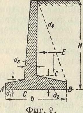 л;—расстояние от равнодействующей до переднего ребра основания П. с.; р—допускаемое давление на грунт в т/м“·, d—толщина вертикальной стенки; (?!—вес стенки; G2— нагрузка на фундаментную плиту, приходящуюся на ширину, равную единице, включая собственный вес плиты и ребер; 8V—статич. момент передней стенки относительно переднего ребра основания П. с.; Sh — статический момент горизонтальной составляющей давления земли относительно того же ребра. Длины выражают в м, вес—в т. По Шеферу (Schafer) ширина фундаментной плиты в П. с. уголковой формы (фигура 10) без ребер определяется по следующим ф-лам при условии, что равнодействующая проходит через крайнюю переднюю точку ядра сечения и при отсутствии временной нагрузхси: