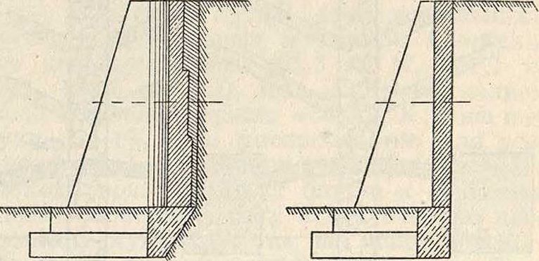 иногда облицовывают более плотным и прочным материалом (смотрите Облицовка). Наименьшей толщиной стенок считается: для бутовой кладки О,GO м, для кирпичной кладки— два кирпича. Все швы надлежит расшивать цементом. В массивных П. с. верх перекрывают массивными плитами, снабженными слезниками. Толщина этих перекрывающих плит 10—15 см. Особое внимание должно быть уделено правильному отводу воды от внутренних поверхностей стен, прокладывая с -этой целью дренаокные трубы (смотрите) или дренируя земляную массу за стенкой каким-либо иным путем (смотрите Дренаж) и устраивая водоотводные канавы на откосах (смотрите). Скопляющуюся в дренах или, при отсутствии таковых, за стенкой воду отводят наружу че рез особые проделанные для этого отверстия в нижней части стены (фигура 17) или выше, если имеются к тому подходящие условия (водонепроницаемый слой в нижней части стены, фигура 18). Земляную засыпку за стену производят слоями толщиной в 0,3 метров каждый, плотно утрамбовывая каждый слой. При этом следует избегать наклонных слоев, могущих образовать скользкие поверхности. При длинных П.с. надлежит принимать меры для парализования возникающих в стенках 1°-ных напряжений, влекущих за собой при нерациональной конструкции поперечные· трещины. Верхнюю часть стены следует сложить на цементном растворе, а позади стены на глубину 1 ми ширину 1 мнадлежит делать каменную пропускающую воду наброску, чтобы таким образом устранить возмояшость сдвига верхней части кладки (при морозах).