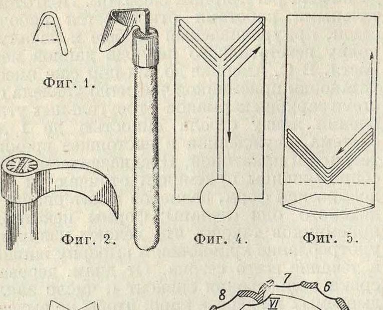 (ординарный и парный)·; фигура 4—схема немецкого способа; фигура 5—схема американского способа; фигура 6—схематический разрез ствола сосны, на котором указан французский способ П.; порядок заложения карр: до 40 лет (на жизнь)—I, II, III, IV, V, ΫΙ и Vir, в 50 лет (на смерть) — 1, 2, 3, 4, 5, 6, 7, 8; фигура 7—америк. карра (с карманом) на русской П. после одного сезона работы