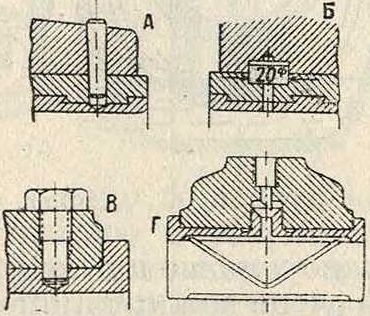 и применяется лишь как заливка вкладышей из чугуна, стального литья, бронзы и латуни. Достоинством белого металла является быстрая приработка к форме шипа, что обеспечивает хорошую смазку. Для того чтобы заливка надежно была соединена с телом вкладыша, делают в нем поперечные и продольные выемки (пазы) сечения в виде ласточкина хвоста, заполняемые белым металлом, как указано на фигуре 5, А и Б, или же делают круглые углубления (фигура 5, В) или сверления (фигура 5,Г и Д). Особенно важно, чтобы заливка не отставала от вкладыша на кромках а и Ь (фигура 5, А) и концах -с и е (фигура 5, Б). В случае, если шип нажимает на торцевую поверхность вкладыша, надо и ее залить белым металлом (фигура 5,Б), или же