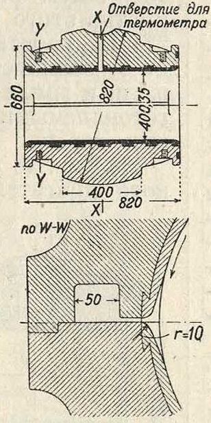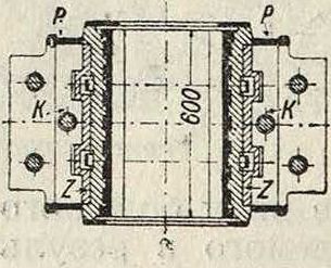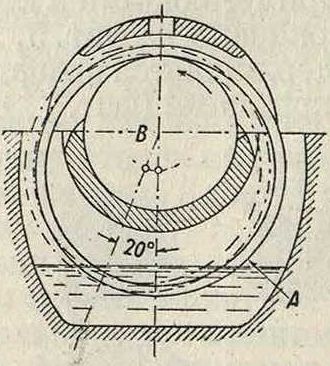 В, в зависимости от направления вращения, на трущиеся поверхности. Чтобы обеспечить непопадание масла на вал помимо вкладышей, пространство, куда масло направляется, ограничено стенкой W. В быстроходных и тяжело нагруженных шипах капельная смазка становится уже недостаточной, она должна подаваться под давлением. Границы применения смазки под давлением зависят от удельного давления на поверхности шипа, от работы трения и от рода действия нагрузок. Высокое давление масла достигается посредством масляного насоса или пресса, приводимых от главной машины. Подобная смазка под давлением применяется например в больших турбодинамо в виду большого количества тепла, получаемого в результате работы трения и подлежащего отводу маслом. На фигуре 17 представлена конструкция вкладышей самоустанавливающегося типа, применяемых в П. завода AEG для паровых турбин. Масло входит через щель между вкладышами, высотой 1 миллиметров, увлекается вращающимся шипом и выходит с противоположной стороны через такую же щель, высотой 3,5 миллиметров.