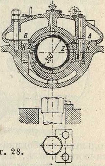 На фигуре 28 представленШ. большого газового двигателя с 4 вкладышами. Смазка производится двумя кольцами. Боковые вкладыши подтяги-