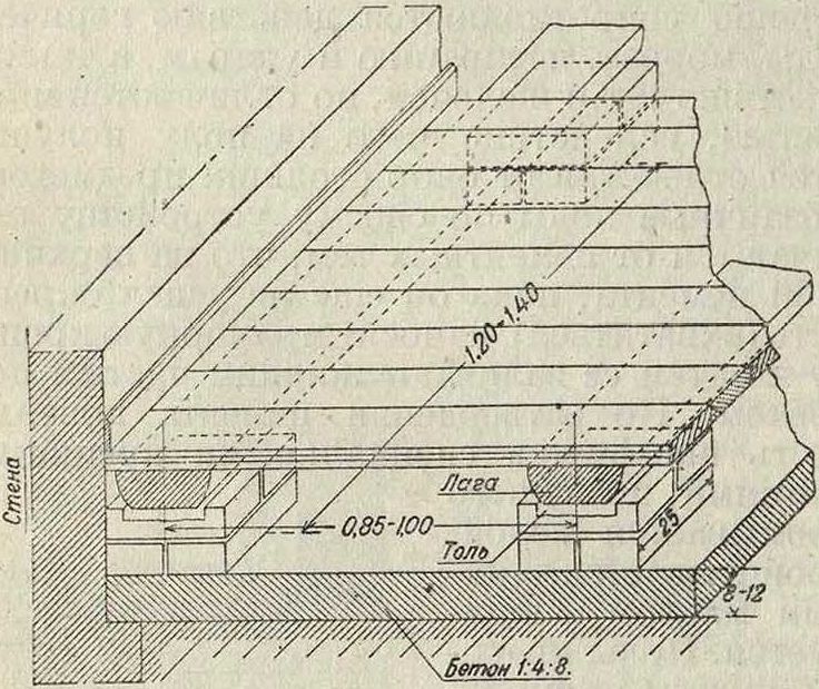 Поверх огнестойких потолков может устраиваться любой деревянный пол по предварительно уложенным лагам из пластин, брусьев или получистых досок (фигура 12, 13 и 18). В местах пересечения деревянных лаг с железными балками необходимо укладывать прокладки из войлока, обернутого толем, для уменьшения звукопроводности перекрытия. Паркетные же полы по огнестойким потолкам б.ч. устраивают по предварительно нанесенной бетонной подготовке и асфальту (фигура 19а и 196). Здесь паркетные дощечки укладывают на го-