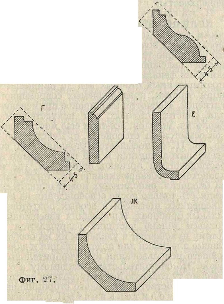 ный (сосновый или дубовый) багет, приготовляющийся с различными профилями из 6-см брусков (фигура 27, А). Галтели можно приготовлять также и из 1,5-слг (фигура 27, Б) или 4—5-см досок (фигура 27, В и Г), что однако не совсем практично, так как подоб^ куе галтели у полов не крепко держатся и легко раскалываются. В отличие от плинтусов галтели принято приколачивать прямо к полу. В несгораемых полах из цемента, мозаики и асфальта галтели и плинтусы вытягиваются из этих же материалов, в плиточных же делаются из специальных плиток (фигура 27, Д, Е, Ж).