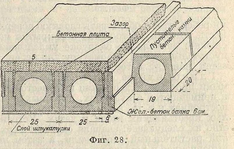 проводностыо. Для устранения этого недостатка сконструирован ряд перекрытий с включением пустотелых бетонных камней из шлако-, пемзо- и других легких бетонов. На фигуре 28 представлена конструкция пустотелого железобетонного потолка системы Хербста, состоящая из железобетонных балок /укладываемых на расстоянии 25 сантиметров одна от другой; пространство между балками заполняют пустотелыми камнями, а образовавшиеся промежутки заливают цементным раствором; сверх всего перекрытия наносят бетонную плиту толщиной 5 см, на которой наклонные для