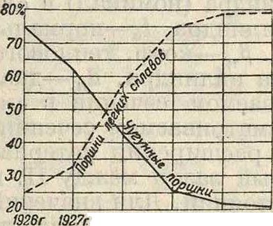 личивают также общую жесткость П. Весьма большое влияние на тепловой режим оказывает материал, из которого изготовляются П. Чаще всего для изготовления П. служит чугун или различные алюминиевые и магниевые сплавы. Ранее II. изготовлялись исключительно из чугуна. Постепенно с увеличением быстроходности двигателей возникла необходимость в максимальном облегчении веса поступательно движущихся частей двигателя; в связи с этим чугунные П. начали вытесняться П. из легких сплавов, тем более что поршни из легких сплавов имеют значительные преимущества перед чугунными П. и с точки зрения их теплового режима. В настоящее время для авиационных двигателей применяются исключительно поршни из легких сплавов. Применение легких сплавов для авиационных двигателей имеет особое значение благодаря нек-рому повышению мощности и главное уменьшению общего веса двигателя. За последние годы быстро происходит процесс вытеснения П. чугунных П. из легких сплавов (главн. обр. алюминия и магния) и в области автомобильных двигателей. Указанное положение подтверждается графиком фигура 4, на которой дано %-ное отношение за последние 5 лет двигателей американ. легковых автомобилей, имеющих П. из различных материалов. На этом графике сплошной линией показаны чугунные II. и пунктиром—П. из легких сплавов. Чу-Фигура 4. гунные П. остаются пока лишь в сравнительно тихоходных двигателях для тракторов и грузовых автомобилей. Серьезным преимуществом П. из легких сплавов является более благоприятный режим II. в тепловом отношении; это м. б. объяснено тем, что коэф. теплопередачи от горячих газов к поверхности П. несколько ниже у П. из легких сплавов, чем у чугунных; с другой стороны, коэф. теплопроводности у II. из легких сплавов значительно выше, чем у чугунных. Благодаря этому меньшая часть тепла процесса передается к днищу П., переданное же днищу тепло скорее будет отведено к стенкам цилиндра. Этими двумя факторами и обусловливается более низкая 1° П. из легких сплавов по сравнению с чугунными. На фигуре 5 приведена сравнительная диаграмма, показывающая t° в различных точках П. (о—центр днища, б—днище, в— боковая стенка, г—юбка) из чугуна (кривая