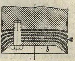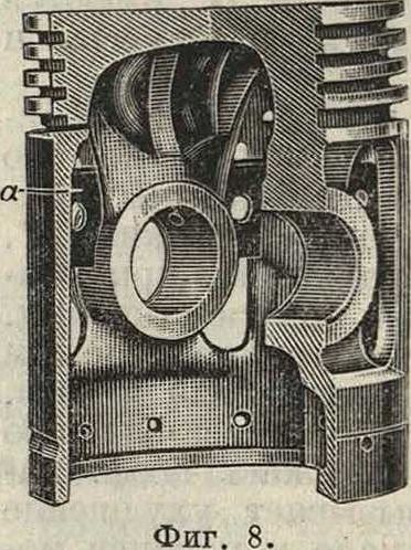 фигура 7. Благодаря указанным вырезам уменьшается переток тепла от верхней части П. к юбке, что значительно понижает ί° последней, а следовательно и те зазоры, какие необходимо давать в нижней части П. Широкое распространение получили в последнее время патентованные П. «Bohnalite» с инваро-выми пластинами а, влитыми в тело поршня (фигура 8 и 9). Инвар (invariable) представляет 36%-ный сплав никеля с железом, имеющий весьма низкий коэф. теплового расширения, примерно в 10 раз меньше, чем у чугуна. Поршни «Bohnalite», так же как и ранее описанные имеют пружинящую юбку с косым прорезом и выточку, отделяющую верхнюю часть П." от нижней для уменьшения пере-