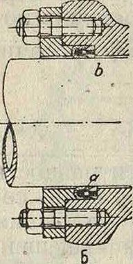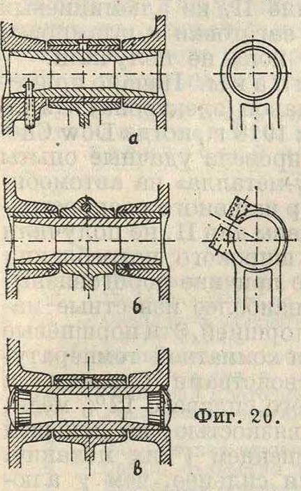 1) с закреплением пальца в поршневой ба-бышке [вращение осуществляется в верхней головке шатуна (фигура 20, а)]; 2) с закреплением затяжкой пальца в верхней головке шатуна [вращение в этом случае осуществляется в поршневых бабышках (фигура 20, б)] и 3) без закрепления в П. и в шатуне [плавающий палец (фигура 20, в)]. Для того чтобы плавающий палец не выходил из П. и не мог при этом задрать зеркала цилиндра, с торцов пальца в отверстия поршневых ба-бышек вставляются алюминиевые или бронзовые грибки. Взамен грибков у торцов пальца располагаются иногда пружинящие кольца, частично входящие *в выточку, специально сделанную внутри поршневой бабьппки. В тех местах П., где происходит относительное вращение, в бабьппки или в верхнюю головку шатуна запрессовываются бронзовые втулки. Если вращение происходит у бабьппки, то у алюминиевых П. втулки могут и не ставиться. Расчет опорных поверхностей ведется из условия невыдавливания смазки