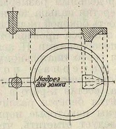 Поршневые кольца, изготовляемые обычно из чугуна, служат для создания герметичности между П. и боковой поверхностью цилиндра; плотное прилегание кольца к стенке цилиндра достигается за счет пр’у-жинения кольца, для чего в кольце делается соответствующий вырез. Чаще всего делают косой стык кольца (фигура 18, а). Некоторое распространение имеет вертикальпый стык (фигура 18, b). Ступенчатый стык (фигура 18, с), обеспечивая большую плотность в стыке, несколько усложняет изготовление кольца. Ряд другихпредложенных форм стыка кольца широкого применения не получил. Следует отметить попытку располагать рядом в одной канавке два кольца со смещенными друг относительно друга стыками. Такое устройство должно дать несколько более надежное уплотнение, однако также широкого практич. применения пока не имеет. Помимо колец, служащих для создания герметичности между стенкой цилиндра и П. (компрессионные кольца), П. снабжаются специальными маслораспределительными кольцами, обычно по одному на П. Назначение маслораспределительного кольца—собирать масло и равномерно распределять по поверхности стенки цилипдра. В нек-рых случаях роль маслораспределительного кольца выполняет нижнее компрессионное кольцо. Типичный вид маслораспределительного кольца дан на фигуре 19. Имеющиеся по окружности кольца отверстия служат для того, чтобы не допустить при движении кольца вверх и вниз перекачки значительных количеств масла, собранного со стенок, к верху цилиндра. Такие же отверстия имеются и в канавке П., благодаря чему часть масла стекает непосредственно внутрь П. и в картер. По наружной поверхности маслораспределительное кольцо снабжается канавкой, идущей по его окружности. Это сделано для того, чтобы равномернее распределить масло по окружности цилиндра. При работе двигателя кбль-ца могут вращаться вокруг П. В четырехтактных двигателях это обстоятельство не вызывает каких-либо затруднений. В двухтактных же двигателях, если кольцо станет стыком против продувочных окон, это может вызвать поломку кольца и аварию двигателя. Поэтому в этих случаях кольца закрепляются на П. специальными шпильками. Идеальная форма поршневого кольца такая, при которой кольца, вставленные в цилиндр, оказывают на стенки последнего равномерное давление по всей окружности. Для осуществления этого кольцо должно иметь некруглую форму, характеризуемую переменным радиусом кривизны (по Беннету),