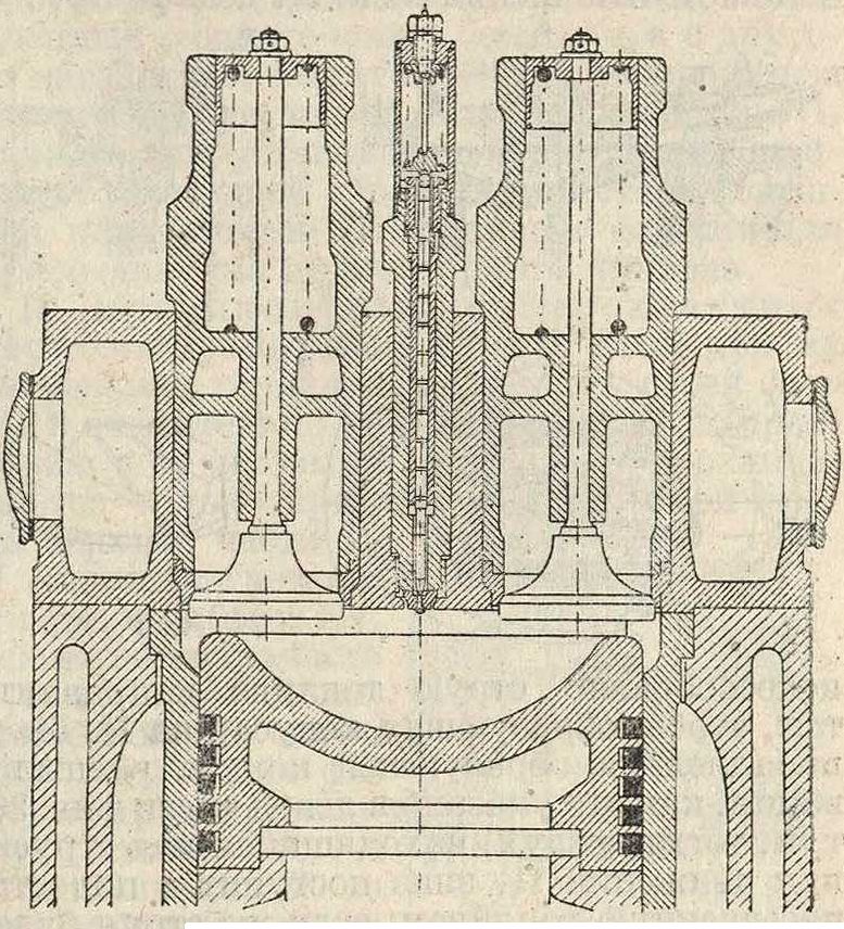 (фигура 13) величиной удельного давления можно пренебречь. В виду этого юбка П., назначением которой и служит воспринятие удельных давлений,м. б. в соответствующих местах удалена; при этом приходим к П. типа Рикардо, дающего значительное облегчение веса поршня (фигура 14). Для представления о практически назначаемых размерах П. на фигуре 15а и 16 приведены чертежи выполненных П.—чугунного П. двигателя «Геркулес» и алюминиевого П. двигателя «Форд». Приведенные выше типовые конструкции дают представление о П. четырехтактных бензиновых двигателей. В двигателях двухтактных П. снабжаются т. н. отражательными козырьками, служащими для предотвращения перетекания засасываемой смеси непосредственно через выхлопные окна. Различные типы головки П. двухтактного двигателя с козырьком даны на фигуре 17. В быстроходных дизелях П. иногда принимают специфич. форму, в зависимости от типа двигателя. В частности в дизелях с вспомо-Фигура и. гательной воздушной камерой последняя иногда располагается в П. (двигатели Акро-Бош, фигура 156),. что существенно изменяет его конструкцию.