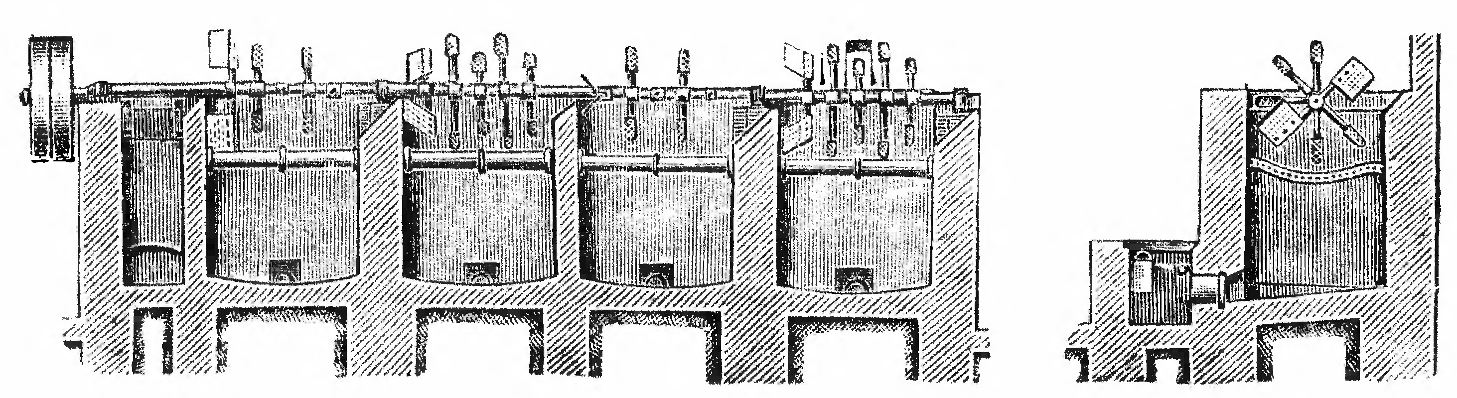 Работа по выработке крахмала ведется следующим образом. Поступающий в завод картофель моется в особых мойках. На рисунке 293 представлена наиболее распространенная кулачная мойка; она представляет собою деревянный или каменный ящик, разделенный перегородками на камеры. Камер бывает, смотря по производительности, от 2 до 4. Над ящиком лежит вал, на котором по винтовой линии расположены била.