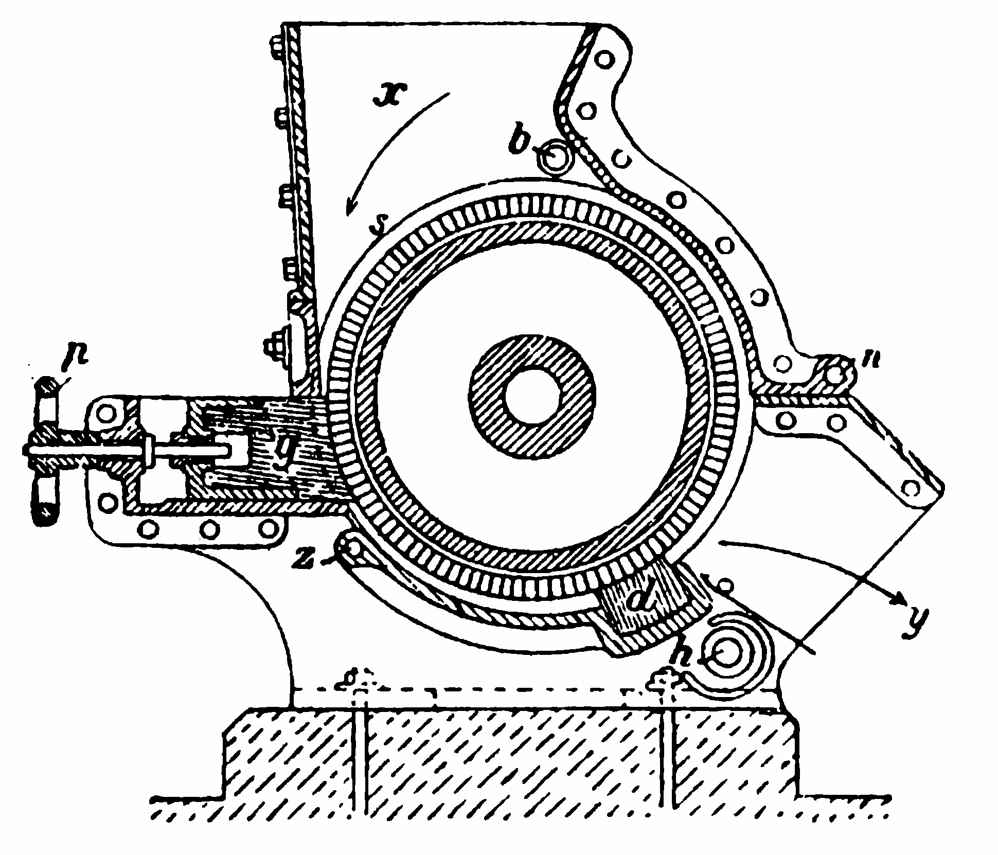 Грязь и мелкие камешки проваливаются через решетку на дно ящика, откуда по временам выгребаются через люки, крупные же камни остаются на решетке и после остановки мойки выбрасываются. Далее вымытый картофель измельчается на терке. Назначение терки — разорвать клетки и освободить крахмал. Для этой цели чаще употребляется пильная терка (рисунок 294). Главную ее часть представляет быстро вращающийся барабан, наружная поверхность которого состоит из большого числа зазубренных стальных пилок (рисунок 295). Пилки чередуются со стальными прокладками так, что над поверхностью прокладок выступают только одни зубья. Картофель поступает в воронку х и собственным весом прижимается к барабану s. Истертый картофель — кашка, поступающий вместе с водою через трубу b, захватывается поверхностью барабана и выкидывается в яму через отверстие y. Упор g помощью маховика р устанавливается на нужное расстояние от поверхности барабана, чем достигается нужная степень измельчения кашки.