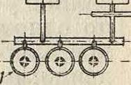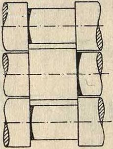 29). Вследствие необходимости убрать металл, к-рый получает вытяжку в предыдущем ручье, диаметр вв последующего ручья должен быть больше, чтобы иметь большую скорость. Семиввые станы имеют три клети. Средняя клеть, как видно из схемы (фигура 30), трио, а две другие клети дуо, расположенные спереди и сзади клети трио. Трио-клеть должна иметь диаметр вв больший, чем у дуо-клетей, для получения большей окружной скорости вв. Оба типа прокатных станов не обладают какими-либо особыми преимуществами сравнительно со станами других, более обычных типов и вместе с тем