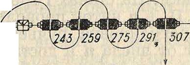6—отделочные клети, 7—моталки Эдепбор-на, 8— клети для сортовой прокатки, 9— электролизеры для электролиза меди, 10— травильный чан, И—транспортер на склад), из которых первая, обжимная, имеет трио-клеть с диам. вв 400—450 миллиметров, а чаще всего 420 миллиметров, с длиною вв 1 400 миллиметров, с числом об/м. до 125. Число клетей 1—5, из них для ГГ. проволоки служит одна, редко две, а в остальных прокатывают прутки и полосы. Вторая линия, черновая, имеет клети трио и простые дуо с диам. вв 240—300 миллиметров, длиною вв 700 миллиметров и числом об/м. не более 400. В клетях этой линии (3—8 в зависимости от схемы прокатки) располагаются попеременно квадраты и овалы, всего 4— 8 калибров. В нек-рых станах эта промежуточная линия отсутствует, и непосредственно с обжимной линии металл переходит в отделочную линию клетей (стан Коль-чугинского з-да). Отделочная линия имеет клети дуо с валками 0 250—270 миллиметров, дли ною до 700 миллиметров и до 500 об/м. Здесь расположены калибры квадрат-овал и последний калибр—круг,всего обычно 5—9 пропусков. Из последнего ручья проволока автоматически попадает на моталки, расположенные непосредственно вблизи отделочной линии стана, где сматывается в мотки. Работа., начиная обычно с черновой линии, ведётся петлями. Для нагрева слитков (вайербарсов весом 85—120 килограмм) служат методические печи, обслуживаемые толкателями, причем нагретый слиток после прохождения через печь или скатывается от печи и попадает на ролики, подающие его в валки, или подвозится от печи на ручной тележке, или подается клещами на подвесном пути. Производительность наших меднопр окатных станов до недавнего времени не превосходила 25 тонн в 8-час. смену. В настоящее время проволочные станы в СССР реконструируются с доведением их производительности до 80 тонн в смену (Кольчугинский з-д, Севкабель и др.). Производительность некоторых заграничных станов достигает 20 т/ч катаной медной проволоки диаметром 6,5 миллиметров. Привод у большинства действующих станов общий от одного мотора, причем передача совершается канатами, ремнями, редко стальной лентой. В новейших станах, напротив, предпочитают снабжать отдельные линии стана самостоятельными электромоторами. Мощность электромоторов в последнем случае 600—750 ГР для каждой линии, в первом же случае 850—1 000 ГР и выше.