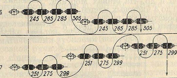 3) Ступенчатое расположение. При все более и более увеличивающейся скорости вращения вв в чистовой линии при прокатке проволоки явилась необходимость разбить чистовую линию на две, а в последнее время даже на три и четыре линии с целью более равномерного увеличения числа оборотов в каждой линии (фигура 33). Ступенчатое расположение впервые было применено Гарретом, а нотому вся установка носит название стана Гаррета. Тип стана, имеющий в чистовой линии четыре ступени (по две клети в одной ступени) носит название стана Гаррета-Кромвеля. Каждая ступень может приводиться в движение от отдельного мотора. Число оборотов в отдельных линиях составляет: в обжимная линия