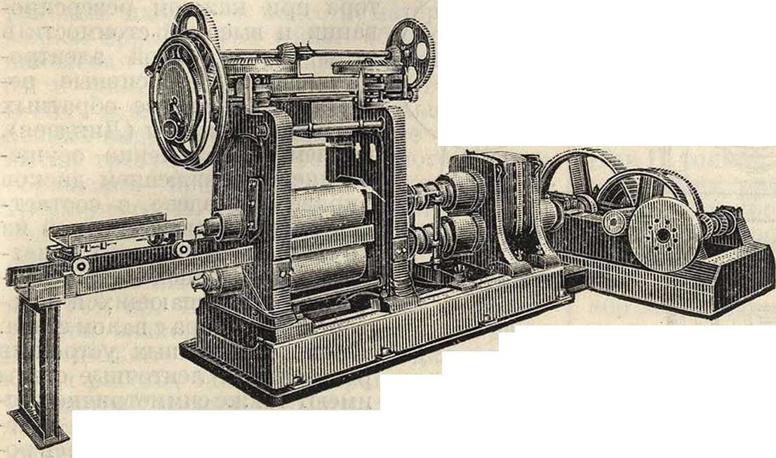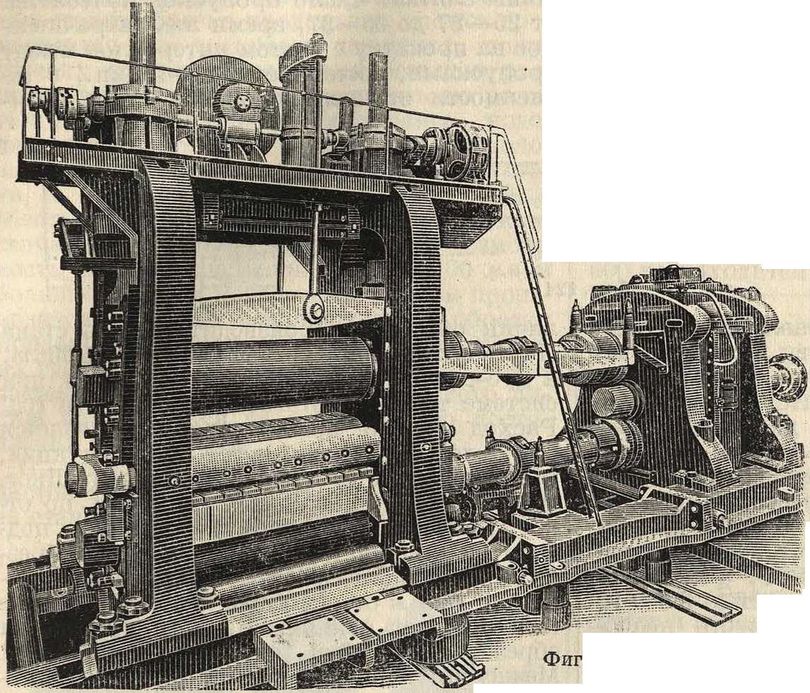 Двигатель б. ч. общий, причем движение от одной линии к другой передается при посредстве ременной или канатной передачи. Число оборотов у каждой линии различное: если у обжимной линии их 80—90, то у черновой и чистовой может быть 200 — 270. Подобное расположение значительно повышает производительность стана, т. к. прокатка производится независимо на каждой линии при различных скоростях.