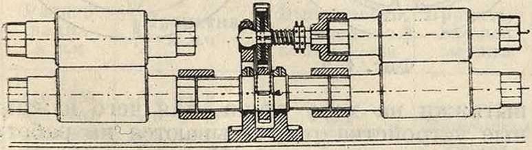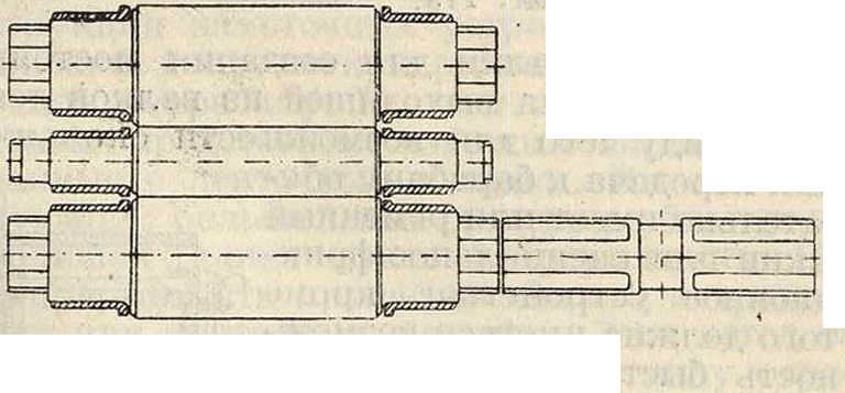 осевой линии имеет место приподнимание нижних вв и обратные удары их после пропусков в том случае, если данная клеть стоит ниже соседних клетей. Равным образом недопустима установка отдельных клетей с приводными верхними валками без шестеренных клетей у каждой клети стана, т. к. прямолинейность ^осей всех верхних вв уже вовсе не может иметь место в виду разного подъема верхнего валка в отдельных клетях. При несоблюдении этого требования в клетях-, где верхний валок стоит выше соседних, неизбежны удары валка по металлу в момент подачи металла в рядом стоящих клетях. В легких станах обыкновенно применяется взамен шестеренных клетей установка шестерен с зубьями достаточной длины непосредственно на трефы верхнего и нижнего вв, что дает значительную экономию как в месте, так и в стоимости.