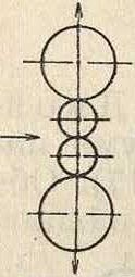 собен безопасно передавать. С целью уменьшения диам. вв в последние 2 г. в Америке сконструированы многоввые станы (4-ввые), в которых приводными являются не рабочие валки, а намоточные барабаны. Вследствие этого рабочие валки освобождены от передачи вращающего, момента .И: могут иметь минимальный диам. Схема таких станов дана на фигуре 152 и 153, Такие станы имеют диаметры рабочих вв 100— j