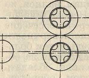 3) К о м б и н и р о в а н н ы о д у о. Это название присвоено особому расположению вв в проволочных, а иногда и в мелкосортных станах, когда в клетях для трио помещаются лишь два валка, причем, если в одной клети имеются верхний и средний валки, то в соседней клети — средний и нижний валки. При подобном расположении вв прокатка производится петлями и одновременно могут работать все клети.