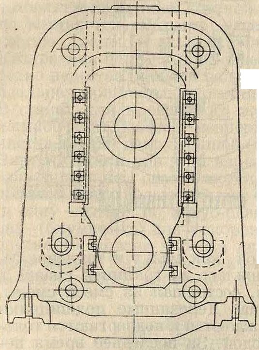 Выбор системы мотора производится в зависимости отданных условий, причем для случая установки трехфазного мотора учитывается необходимость иметь для регулирования специальные устройства (сист. Кремера или Шербиуса), т. к. регулировка оборотов мотора путем включения сопротивления в ротор для данных, сравнительно больших мощностей является уже менее выгодной. Привод от моторак стану в последнее время осуществляютчерез редуктор (фигура 139а и 1396, стан трио Лаута), а не ременный, причем благодаря большой точности в изготовлении всего редуктора полагают возможным помещать маховик не между шестеренной клетью и редуктором, а на оси мотора. При этом расположении маховика последний получает меньшие размеры и вес, но зато редуктор не предохранен от всехударов, возникающих при П. При большом снижении числа оборотов от мотора к стану, неосуществимом одной парой шестерен, применяют редуктор с двумя парами шестерен, причем располагают половинки (по ширине) больших шестерен симметрично по обе стороны от малых шестерен (фигура 140). При необходимости иметь несколько различных скоростей П. (например 1,1 м/ск для алюминия-и 2,4 м/ск для латуни) в одном стане, ставят или сложный редуктор (5—6 сцеплений), или асинхронный электромотор с переключением полюсов, или же два мотора с рас-цепными муфтами. Передача от шестеренной клети к валкам осуществляется шарнирными шпинделями с бронзовыми щеками, дающими несравненно более плавный ход, чем обычные соединительные шпиндели. Клеть трио-стана имеет валки размером 0 500—650 миллиметров и 900—1 500 миллиметров длины, причем для П. слитков весом 300 килограмм вполне достаточно иметь валки 550 х 1 000 миллиметров, тогда как для П. 600-ка слитков более подходит размер вв 650x1 500 миллиметров. Валки применяются из серого чугуна с закаленной рабочей поверхностью. Глубина закалки берется 20—25 миллиметров, причем во время работы обильно поливают подогретой водой с тем расчетом, чтобы валки оставались чуть теплыми. Для смены вв применяют специальные устройства из вдвигаег мых в клеть вдоль оси вв полозьев и рамы на колесах, въезжающей по полозьям в клеть; на эту подвижную раму кладется или к” ней подвешивается сменяемый валок, кото-рый^затем свободно выкатывается наружу по полозьям. Трио-стан: с верхним и нижним подъемными валками имеет