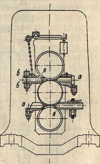 сделан приводным; 3) видоизмененной системы Лаута, отличающейся от первой тем, что все три валка рабочей клети имеют одинаковый диаметр; 4) системы обычного трио с тремя валками равного диаметра (фигура 138), приводимыми во вращение от шестеренной клети; в этой системе верхний и нижний валки подъемные, а средний неподъемный. Установка верхнего и нижнего вв производится с помощью специатъ-ных устройств. Производительность станов
