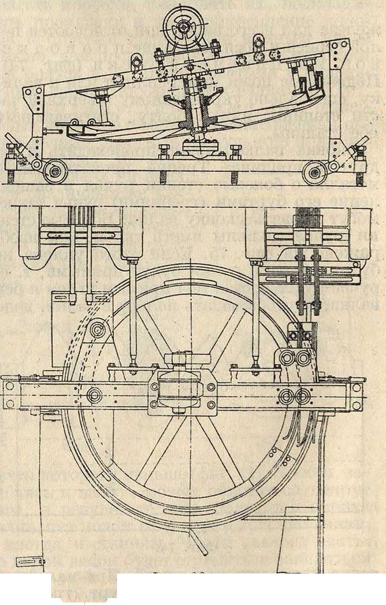 но бывают только дуо-реверсивные; б) толстолистовые станы, предназначенные для прокатки толстых листов, то есть листов толщиной более 10 миллиметров, с диам. вв 700— 1 100 миллиметров и длиной полотна 2 000—3 500лш; обычно бывают дуо-реверсивные или трио сист. Лаута; в) среднелистовые станы, предназначенные для прокатки средних листов, то есть листов толщиной 3—10 миллиметров, с диам. вв 700—850 миллиметров и длиной полотна 2 000— 3 000 миллиметров; почти исключительно трио сист. Лаута; г) тонколистовые станы, предназначенные для прокатки тонких листов, то есть листов толщиной 1—3 миллиметров, с диам. вв 500—700ли и длиной полотна 1000—1500 миллиметров; обыкновенно делаются дуо-нереверсивными. 7) Универсальные станы (вкл. л., 3), станы, предназначенные для прокатки широкополосного железа, делятся на а) дуо-не-реверсивные (обычно в соединении с каким-нибудь другим станом); б) дуо-реверсивные и в) трио. 8) Бандажепрокатные станы для прокатки вагонных и паровозных бандажей .9) Трубопрокатные станы для прокатки сварных и бесшовных труб. 10) Специальные станы для прокатки дисковых колес (фигура 13), волнистого же-