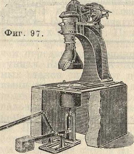 (ок. 5 JP) или от трансмиссии через кривошипный механизм. Резец, зажатый в оправке (укрепленной на горизонтальном ползуне), получает движение с размахом ок. 300 миллиметров. Стол с полосой прижимаются к резцу ногой рабочего, а в горизонтальной плоскости передвигаются руками. Кроме станков этого типа при шабровке более длинных и тонких полос применяются перемоточные барабаны со стоящим между ними наклонным столом, по которому скользит лента и здесь шабруется вручную. 2) Ножницы. Для разрезки листового металла, полосовой заготовки и прочие служат гильотинные ножницы самых разнообразных размеров и мощностей. Для удержания листа при точной разрезке применяются ручные зажимы, некоторые же ножницы имеют на верхней подвижной части зажимы на пружинах, которые и придавливают разрезываемый лист к столу в момент опускания верхнего ножа. Для разрезки полос на равные части по длине, равно как для резки листов однообразных размеров, пользуются упорами, которые укрепляются на переднем столе и позади ножниц. Для обрезки кромок у полосовой заготовки и лент или для разрезки на небольшое число частей применяют ножницы с круглыми ножами (смотрите Ножницы) с одним намоточным барабаном. Для разрезки ленты значительной ширины на отдельные части (по ширине) служат ножницы этого же типа; намоточное устройство имеет несколько барабанов для лент и два барабана для намотки обрезков (кромок). Круглые ножи с пазом насаживаются на два вала ножниц, имеющие шпонки по всей длине; для регулировки же расстояния между ножами данного вала пользуются точно калиброванными кольцевыми шаблонами. 3) П р а в и л ь н и е станки. При изготовлении листов ленточным способом ленты пропускаются через комбинированные правильные станки с гильотинными ножницами (фигура 161). На правильных станках под