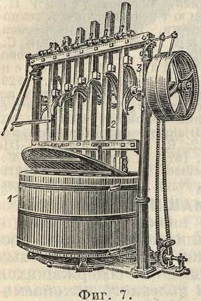 Для промывки пряжи и тканей применяют промывные ирландские молоты. Товар закладывают в выемку, сделанную в деревянном массиве; сюда поступает и вода. Деревянный молот, который играет роль валька, поднимается кулачковым механизмом и падает на товар, выжимая из него грязную воду, и в то же время переворачивает промываемый материал. П. м. для промывки трикотажных изделий (фигура 7) представляют собой деревянную барку—2, монтированную на колесах. Внутри барки имеется три или более деревянных песта 2, которые помощью поперечного вращающегося вала 3 поднимаются и падают по несколько раз в 1 мин. Одновременно с подниманием различают следующего вида: а) П. м. д л я промывки пряжи в мотках. Машины сконструированы так. обр., что мотки пряжи в виде бесконечной цепи проводят через барку, снабженную двумя рядами роликов, направляющих бесконечный жгут пряжи. Иногда для подобной же цели применяют неглубокие промывные резервуары с бесконечными, принудительно перемещающимися транспортерами. Обычно бывает по три резервуара с транспортером в каждом и отжимными валами между ними. б) П. м. для про мы в к и пряжи в виде основы состоят из нескольких ящиков с направляющими роликами и отжимными валами (смотрите Красильные аппараты).