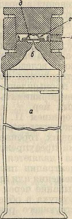 Фигура з. собою ручной поршневой насос (на фигура не изображен), привинчиваемый к отверстью с резьбой ж. Рабочий объём цилиндра насоса равен 50 см3. Воздух в зависимости от запыленности (чтобы ясно была заметна невооруженным глазом пыльная д о р о ж-к а) одним быстрым качанием или несколькими, следующими с нек-рыми промежутками друг за другом, просасывается через трубку а, затем через узкую щель б шириной в 0,1 миллиметров и длиной 10 миллиметров и каналы в Проходя трубку а, стенки которой обложены влажной фильтровальной бумагой, придерживаемой пружиной г, воздух насыщается водяными парами; поступая через щель б со скоростью до 2,5 хЮ4 ом/ос в камеру осаждения П., он резко расширяется и охлаждается. Водяные пары конденсируются на пылинках, и при столкновении с покровным стеклом д пылинки легко к нему прилипают. Покровное стекло прижимается пружиной е; ж—место соединения насоса с камерой. Подсчет частиц производится при помощи микрометрич. окуляра, имеющего стекло е нанесенной на нем сеткой. Установлено, что аппарат улавливает около 90% суспендированной П. и притом до определенного размера (сферич. пылинки до 15—20 μ, отдельные экземпляры до 40—50 μ). Методы Оуенса, Котце и Айткена неприменимы для аэрозолей с высокой степенью дисперсности, т. к. забирают частицы только определенных размеров и не осаждают на пластинке даже всей П., прошедшей через заборное отверстие. Наиболее удовлетворитель--а ным методом полного выделения частиц П. является электроста-тич. их осаждение (смотрите Дымы, и туманы и Электрофильтры) по методу Котреля. Для этой цели употребляют электрич. преципи-таторы, предложенные Тольманом, Греем и Стронгом. На фигуре 4 изображен электрический пылевой счетчик, сконструированный в физич. лаборатории Гос. ин-та охраны труда. Два цилиндра, один а из стекла, другой б из эбонита, надеваются друг на друга. В крышке цилиндра а имеется круглое отверстие в диаметром в 1 миллиметров, служащее для затягивания воздуха. В отверстие вставлена острая игла г толщиной ок. 0,5 миллиметров; между иглой и стенками отверстия в имеется кольцевидный промежуток. В цилиндр б вставлен эбонитовый диск д диам. 5 см, имеющий круглую металлическую сердцевину ою диам. 1,6 см; последняя пружиной з соединяется с клеммой и. Между стенками диска 0 и цилиндра б сделан ряд симметрично расположенных отверстий для прохода воздуха из верхнего цилиндра в нижний. На иглу г и диск ою накладывается высокая разность потенциалов (при опытах с этим счетчиком при-