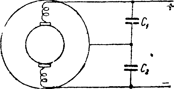 причем imax=— Δω, величины же а и φ суть ф-ии ω и не зависят от i. Т. о. величина помех должна в некоторой мере уменьшаться с повышением избирательности приемников. Действие этого рода помех м. б. направленное тогда, когда они имеют возможность распространяться по электрическим сетям и проводникам, находящимся по соседству с приемным устройством, и далее воздействовать на последнее не только емкостным или индуктивным путем, но и через излучение сети. Поэтому в городах, где имеются благоприятные условия для многократных отражений одного и того же электрич. импульса, число различных Р. значительно больше, чем в открытом месте. Наиболее сильные Р. возникают при емкостной связи мешающей сети с приемным устройством. Что же касается Р., распространяемых путем излучения, то их отношение кР., распространяемым индуктивным действием сети, может определяться для случая рамочного приемника ф-лой где d — расстояние между приемной рамкой и сетью, λ — длина волны, на к-рую настроен приемник. Исследования показывают, что паразитные токи (смотрите), возникающие в приемниках вследствие индуктивной связи, находятся в той же фазе или смещены на 180° по отношению к паразитным токам, вызванным емкостной связью. Следовательно к приемнику можно присоединить устройства, которые взаимной компенсацией паразитных токов, вызванных индуктивной и емкостной связью, устраняли бы Р. Вообще с целью уменьшения Р. прибегают 1) к уменьшению связей источника помех с сетью и сети с приемным устройством, 2) к уменьшению интенсивности искрения и 3) к превращению обычных Р. в симметричные Р. Однако в условиях развития рассматриваемых Р. (города) расчетные нормы поля приходится все же увеличивать в пределах от 10 до 20 децибел. В тех случаях, когда Р. вызываются искрением, значительное, а подчас и полное устранение Р. м. б. достигнуто помощью конденсатора, уменьшающего связь между сетью и цепью искрения. Для случаев моторов схемы включения конденсаторов представлены на фигуре 6 и 7. Когда мотор соединен с проводами + и — распределительной трехпроводной системы с заземленным средним проводом, следует пользоваться схемой фигура 6. В тех случаях, когда мотор соединен с двухпроводной установкой, причем один из проводов является нулевым, прибегают к схеме фигура 7. Конденсаторы в обоих случаях включаются непосредст-