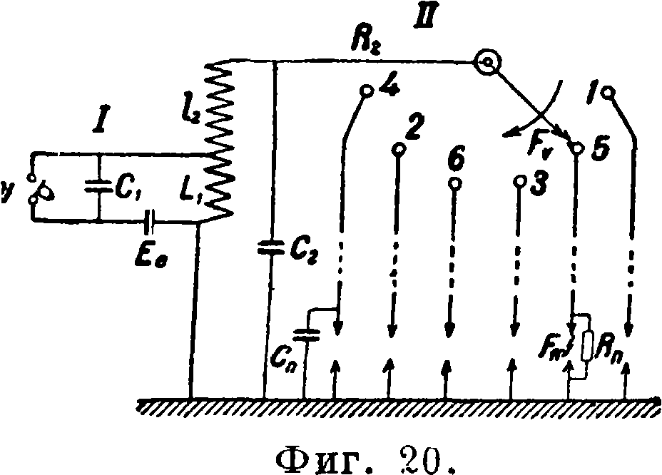 корпуса. Экранирование особенно необходимо для подавления Р., вызываемых системой зажигания двигателя транспортной машины. Независимо от типа зажигания природа Р. одинакова — это искровые разряды, происходящие в цепях зажигания мотора. Далее для конкретности приводится (фигура 20) эквивалентная схема зажигания 6-цилиндрового мотора. Lx и 12— первичная и вторичная обмотки трансформатора, повышающего напряжение до величины, необходимой для проскакивания в Fk искры; Сг — блокирующий конденсатор; Fv изображает контакт во вращающемся распределителе, регулирующем последовательное получение искры в свечах всех цилиндров; Rn — сопротивление воздушного промежутка в момент проскакивания искры; Сп — эквивалентная емкость свечи; С2 — конденсатор, учитывающий емкость всей проводки между магнето и свечами. Первичный ток получается или от батареи (бобинное зажигание) или от магнето. На фигуре 21 даны осциллограммы первичного тока (iг) и первичного напряжения (иг) для случая зажигания от магнето. В момент разрыва первичного тока возникает сильное возрастание напряжения, к-рое дает искру в свече и затем быстро падает. Из схемы видно, что искры проскакивают в трех местах: в прерывателе, в распределителе и в свече. Характер электромагнитных полей, создаваемых искровыми разрядами, весьма сложный и зависит от особенностей пространственного размещения проводов и корпуса машины. Иногда искровой разряд индуктирует в соседнем проводе или в его металлич. оплетке напряжение, достаточное, чтобы соз-