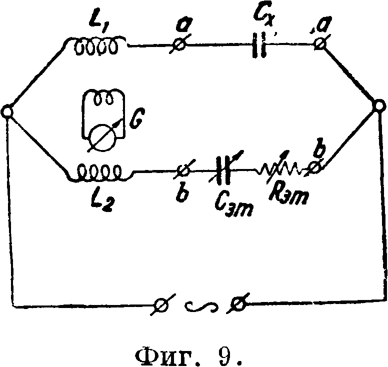 вного сопротивления контура и дает исходные величины для вычисления гх. Активное сопротивление какого-либо одного элемента здесь м. б. определено лишь в том случае, если сопротивление остальных элементов контура известно. з) Измеритель с диференциаль-н ы м т.рансформатором.В одну из ветвей первичной обмотки трансформатора, например в точки аа (фигура 9), включается измеряемый объект, например конденсатор. В точки bb включается цепь, кажущееся сопротивление которой устанавливается тождественным с кажущимся сопротивлением измеряемого объекта. Регулировкой Сэт и Ram добиваются установления нуля эдс в катушке индикатора. Неизвестное активное сопротивление определяется из ур-ия, изображающего равенство активных сопротивлений цепей аа и bb. Такой измеритель дает удовлетворительные результаты при частотах до 106 Hz. Кроме того здесь требуется особенно тщательно соблюдать предосторожности, свойственные Р.