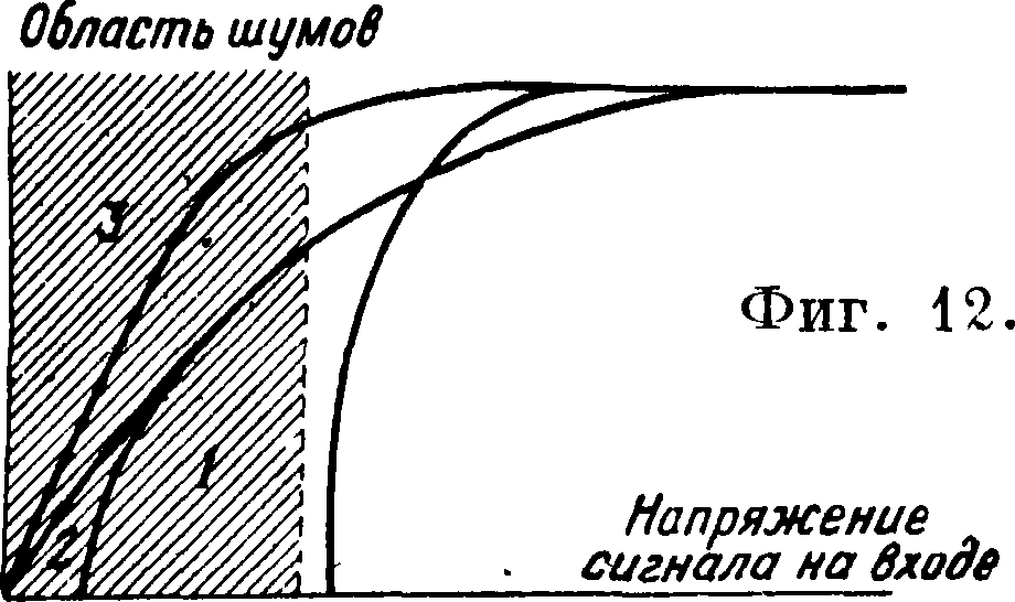 Автоматическая регулировка громкости сигналов (АРГ) как обязательная деталь применяется в каждом Р. для дальнего приема- АРГ в Р. выполняет следующие функции: 1) поддерживает одинаковую силу сигналов различной громкости на выходе, 2) устраняет перегрузку детектора и выходной лампы, что особенно важно в суперах для избежания микрофонного действия гетеродинной или конвертерной лампы, и 3) выравнивает изменения силы сигналов, обязанных замиранию (смотрите). Во всех современных приемниках АРГ осуществляется обычно от отдельных диодных ламп или от многократных ламп с диодами (смотрите Электронная лампа), причем эти же лампы обеспечивают и детектирование сигналов для последующего уси-лейия на низкой частоте. Применение .этих ламп позволило в значительной степени упростить схемы АРГ и привести их к виду, совершенно доступному в любых, даже простейших Р., тогда как при прежних лампах АРГ было достоянием только очень сложных и дорогих Р. Существует целый ряд различных схем АРГ. Здесь приведены принципиально основные. 1) Простое АРГ (фигура 11). Здесь для детектирования использован один диод, для АРГ — другой. АРГ вызывается напряжением, падающим на сопротивлении Л3, и начинается с минимальных напряжений сигнала, вызывая нек-рре снижение чувствительности при слабых сигналах. На фигуре 12 изображена кривая этого вида АРГ (кривая 1). 2) АРГ с задержкой (фигура 13). Здесь к диоду АРГ приложено нек-рое отрицательное напряжение Е благодаря падению напряжения на сопротивлении i?4. АРГ, начинается при напряжениях сигнала, подводимого ко второму диоду выше-i?. Кривая 2 регулирования показана на фигуре 12. 3) АРГ с усилением (фигура 14). Здесь для АРГ использована отдельная лампа дуплекс—диод—триод. Сигнал для АРГ сначала усиливается триодной частью этой лампы, затем передается на диоды, включенные параллельно. Эта схема дает более совершенное и чувствительное АРГ. На фигуре 12 дана