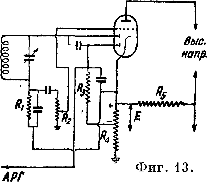 следних Р. с АРГ применяется дополнительное автоматическое регулирование порога чувствительности Р., или (как его иначе называют в английской радиолитературе) автоматич. регулирование «молчания» при настройке (АРМ) илц «тихой настройке». В принципе этот вид регулирования заключается в том, что в отсутствии приема большим отрицательным смещающим напряжением на управляющую сетку приводится в бездействие лампа усиления низкой частоты, следующая за детектором. Приходящий сигнал, задавая положительный потенциал на ту же лампу, уравновешивающий отрицательное напряже-