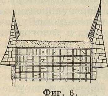 его должны быть тщательно укреплены. С этой целью склоны обрабатывают уступами, уменьшающими живую силу стекающей воды. Не меньшую заботливость проявляют в отношении дна горного потока, подверженного размыву, причем иногда в значительной степени. Размыв дна в данном случае парализуется путем устройства ряда-запруд, сооружаемых из дерева (фигура 4), камня (фигура 5) или смешанного типа в виде деревянных клеток, заполненных камнями (фигура 6). В каждом отдельном случае надлежит решить, в зависимости от наличия тех или иных местных материалов,