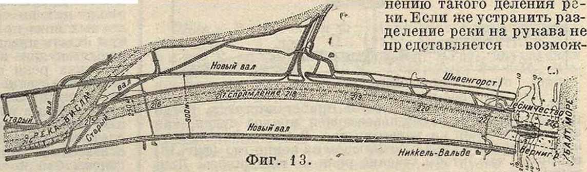 5. Отдельные приемы Р.р. Сюда“ относится: спрямление рек, выправление рукавов, перемещение устья притоков и раздвоение реки. It спрямлению приходится прибегать в тех случаях, когда имеются изгибы большой кривизны, препятствующие судоходству. Т. к. неправильное расположение спрямлений вредно отражается на режиме реки и может угрожать судоходству, то необходимо сугубое внимание по всем вопросам, связанным с этим способом регулирования рек; он приводит иногда к непрерывным землечерпательным работам. Поэтому надлежит заранее взвесить, не следует ли устроить на спрямлении шлюз (смотрите), предоставив реке течь по старому руслу. При таком спрямлении со шлюзом представляется возможным при известных условиях н значительной длине излучин (в несколько км) использовать энергию воды. Что" касается способа выполнения работ по спрямлению русла реки,.то условие непрерывности судоходства требует сооружения спрямленного участка реки до полных проектных размеров, не прибегая к использованию живой силы потока, во-первых, потому, что скорость воды обыкновенно на судоходных реках недостаточна, чтобы в короткий срок образовать новое русло, а, во-вторых, потому, что уменьшение расхода воды в старом рукаве повлекло бы за собой прекращение судоходства на время работ. По окончании работ спрямление м. б. открыто для пропуска воды. Отрывкам, б. произведена насухо, при искусственном понижении уровня грунтовых вод, или при помощи экскаваторов. При незначительной длине спрямления канал должен быть глухим с обоих концов, в противном случае он м. б. глухим лишь в верхней своей части. Когда канал глухой с обоих концов, при понижении уровня грунтовых вод при помощи рва, вода перекачивается в реку через дамбы при помощи насосов. После того как произведена отрывка спрпмительного капала и выполнены работы по укреплению берегов, а если нужно, то и по укреплению подошвы канала путем устройства донных перемычек, разбирают в период половодья верхнюю замыкающую дамбу. Приток воды в спрямительный канал усиливается путем сооружения бунообразных дамб аb, cd в старом речном рукаве (фигура 12). Нафигура 13 представлено спрямление р.Вислы у Шивенгорста с показанием валов или береговых дамб (смотрите), ограничивающих русло высоких вод.
