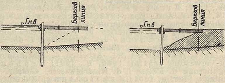 Подвижные устройства применяются по преимуществу в тех местах, где возведение бун или продольных дамб затруднительно. Цель всевозможных подвижных водостеснительных устройств—создать более спокойное течение воды, способствующее отложению около них наносов. От размыва защищают их каменной отсыпкой. Крейтер рекомендует не слишком поспешно производить укрепление новых отложений. На фигуре 22 показано образование естественных отложений наносов при помощи подвесного устройства Вольфа и окончательная форма укрепления берега.